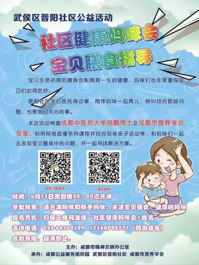 项目落地武侯区晋阳社区,服务对象为0-3岁宝宝的妈咪,为期45天,主题为“社区健康妈咪培育计划”,本系列活动由网络直播和现场体验结合开展,本项目非常有幸的邀请到了胡鹏博士,热爱健康的妈咪们也有机会跟着胡博士一起找到宝贝膳食中的bug,一起用科学营养的方式助你轻松育儿。这里要悄悄告诉你,胡博士也是0-3岁宝宝的家长哦,除了深厚的中医和营养底蕴以外,还可有很多很多理论+生活的结合,干货多多!(此处省略一万字)